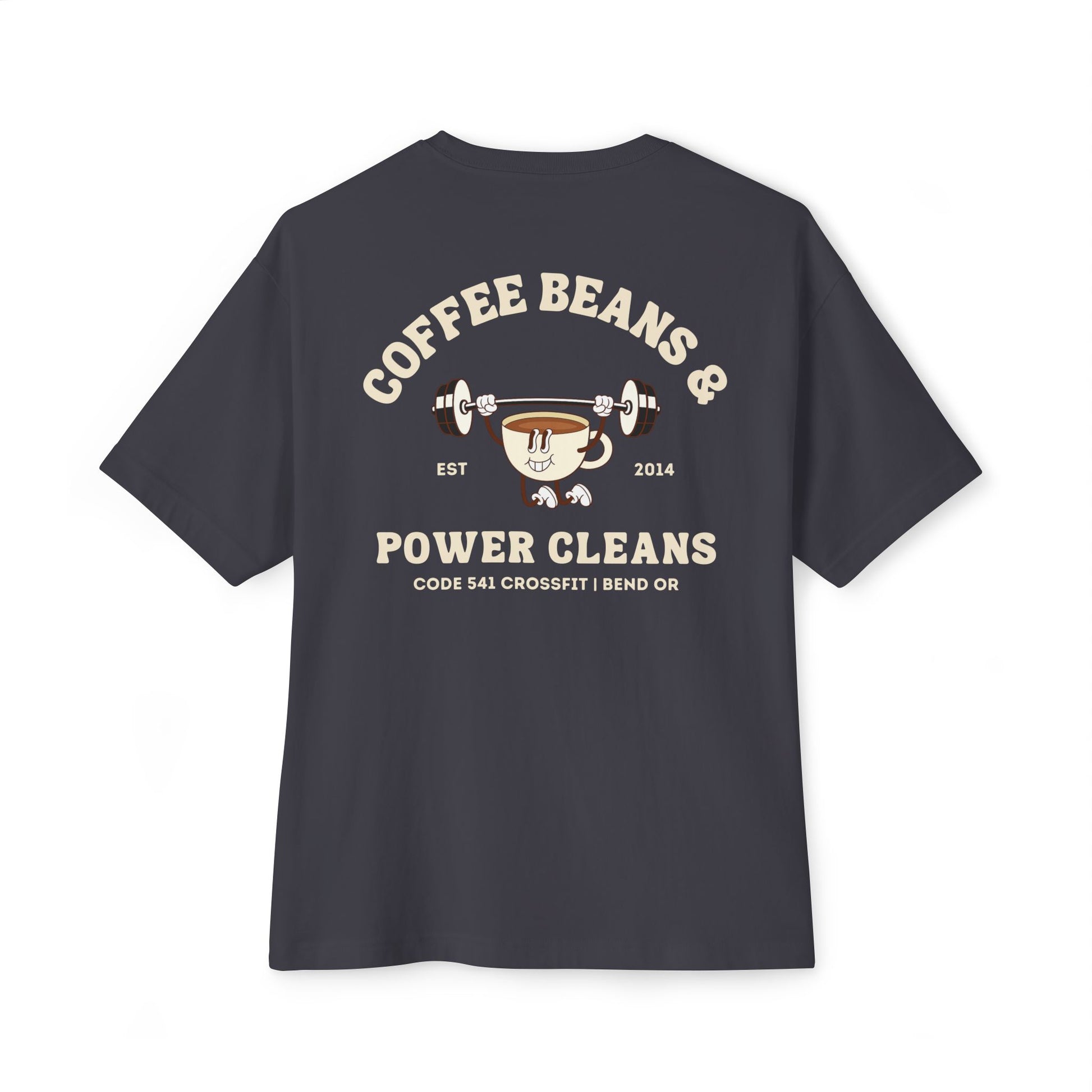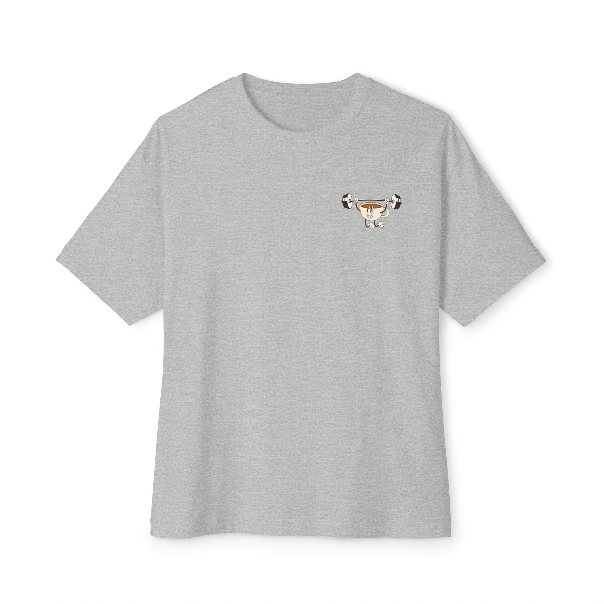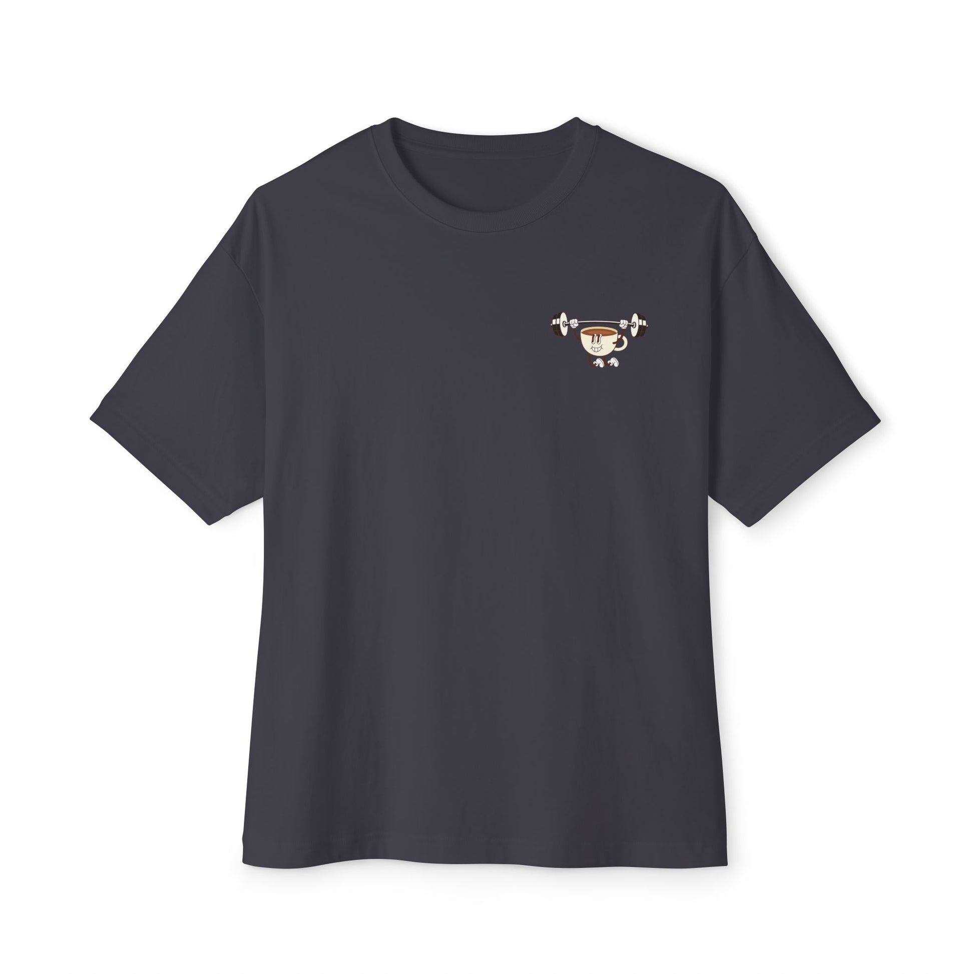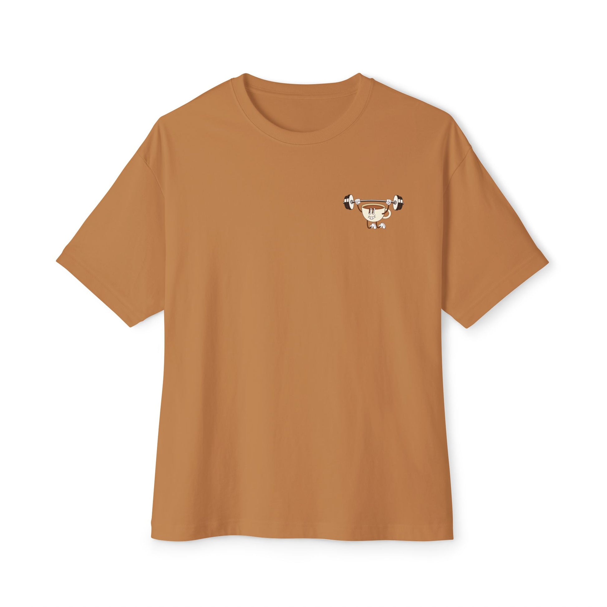 This oversized boxy tee brings together morning ritual and gym grit in one comfortable, lived-in piece.The relaxed drape and dropped shoulders make it easy to slip on before a workout or to wear while you linger over a pour-over. The soft, mid-weight cotton feels familiar and durable—worn-in without being flimsy—so it moves with you from warm-up to cooldown and from coffee run to couch. It’s for people who measure strength in reps and espresso shots, who like retro gym graphics and a tee that feels like part of their routine.